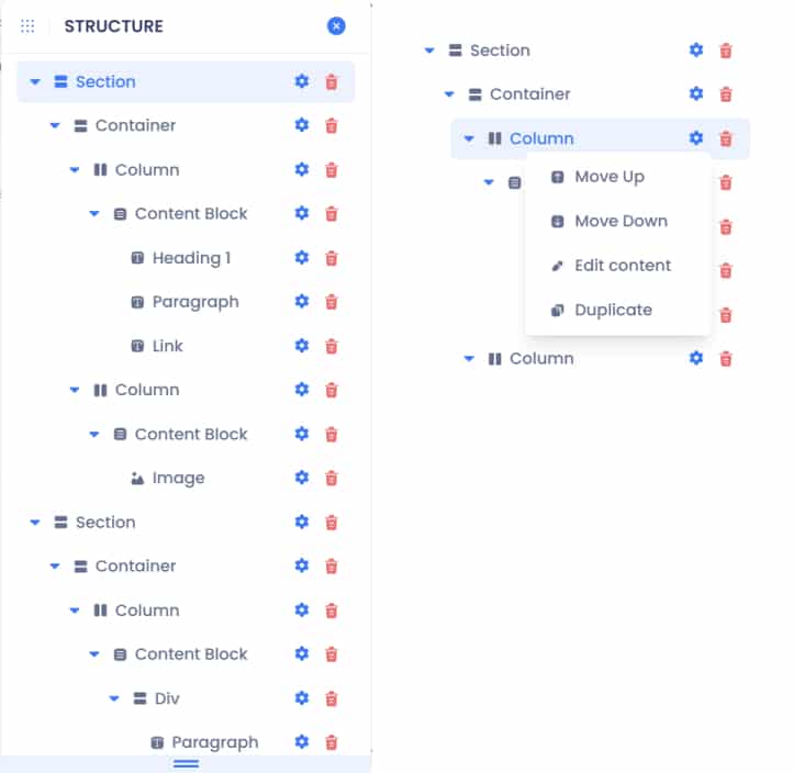 The structure tree also has some unique features to help you manage your page: